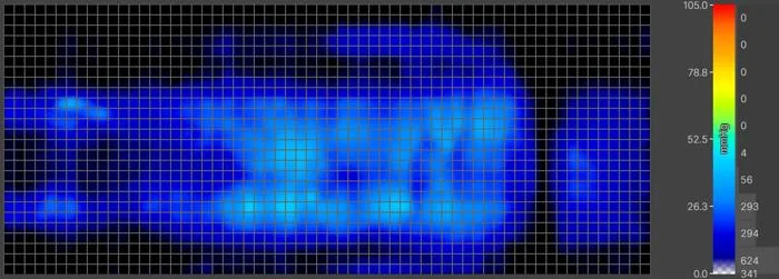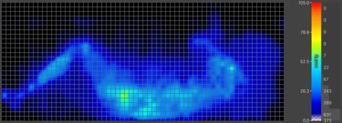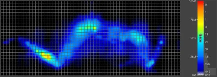 Underneath them, a specialized mat on the surface of the mattress records how much pressure builds up along their body. Using thermal imaging, it creates what we call a pressure “map,” which is a color-coded graphic that shows areas of high (yellow and red) and low (blue and green) pressure. More of the latter means more pressure relief.