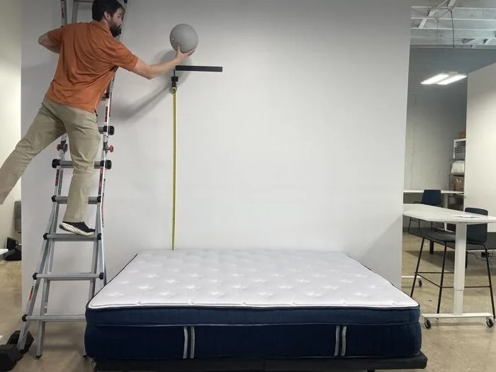 To record sinkage, we place a kettlebell on the surface of the mattress, then use a ruler to measure how much the mattress dips. We measured 3.7” of sinkage, which is only slightly above our average, 3.2”, and still considered “moderate” sinkage. Given the bed’s balanced feel, this rating makes sense.